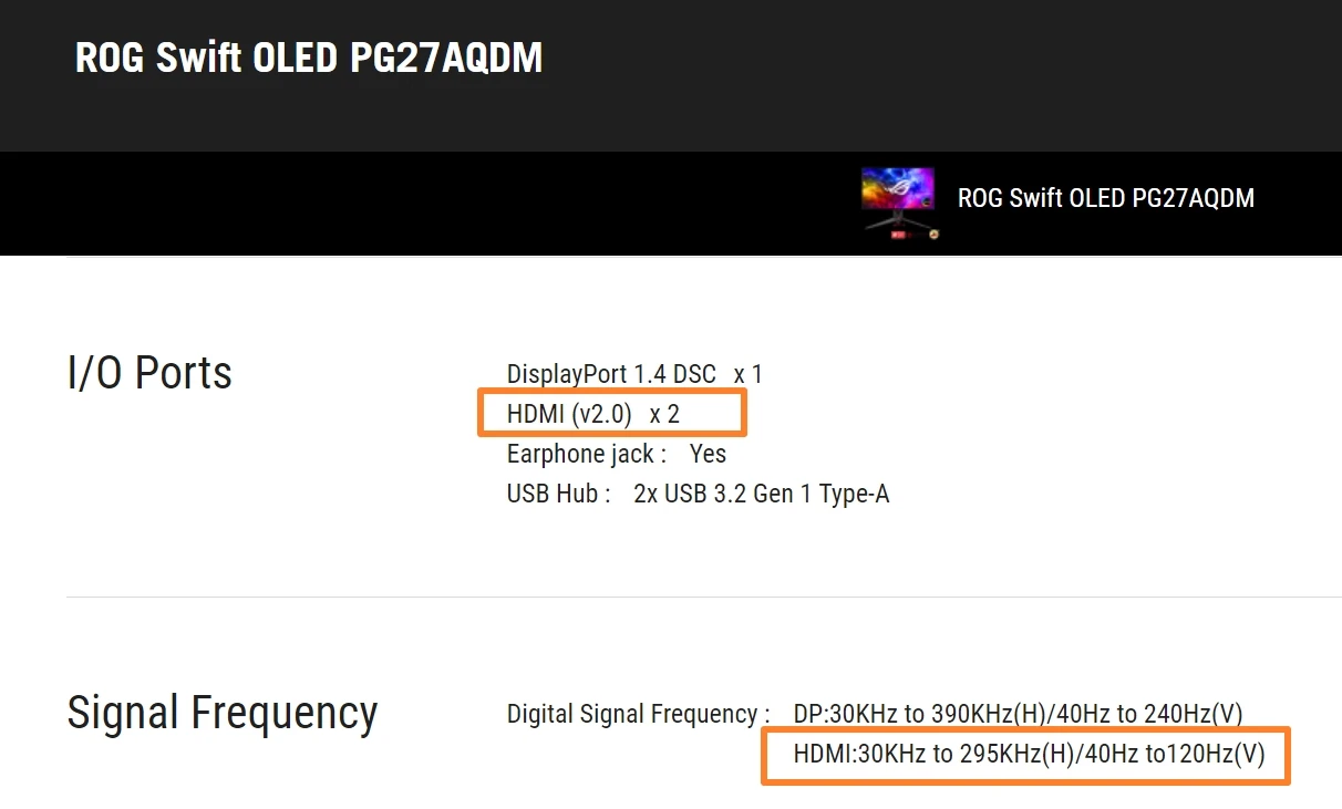 Some monitors, such as the ROG Swift OLED PG27AQDM, only support 2560x1440p240 resolution through their DisplayPort (DP) ports. For HDMI only 2.0