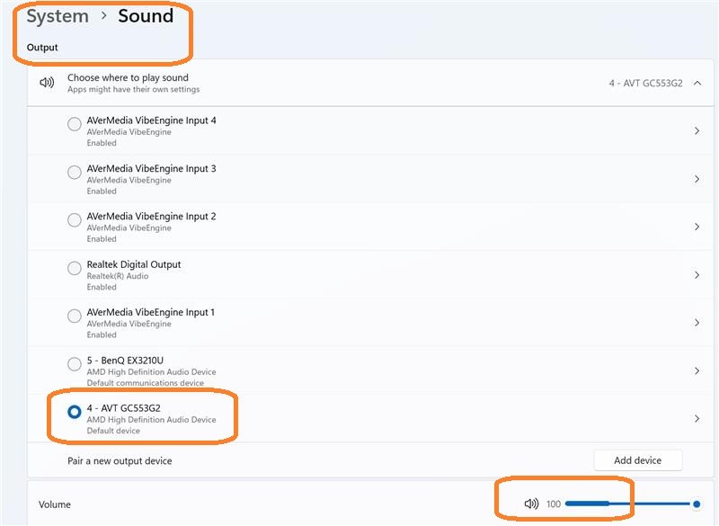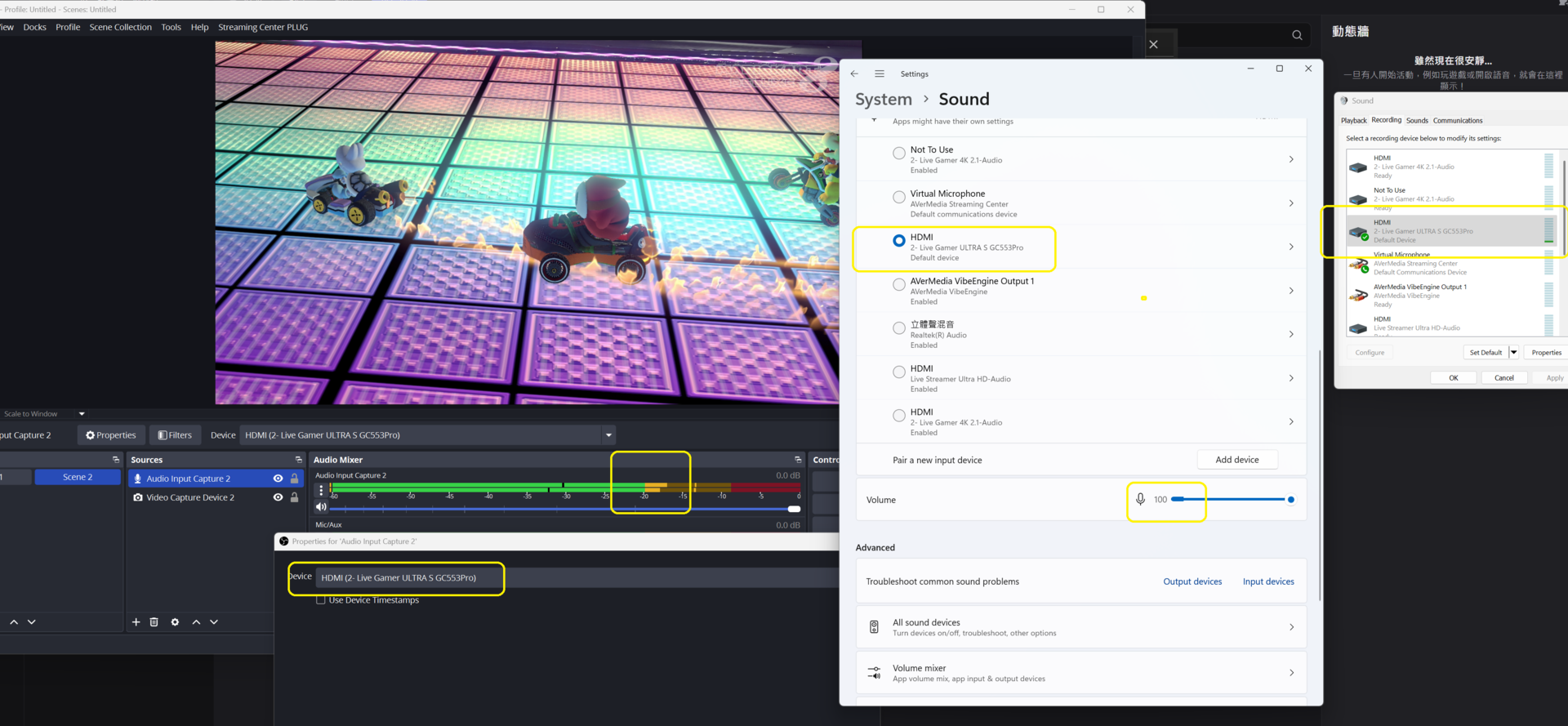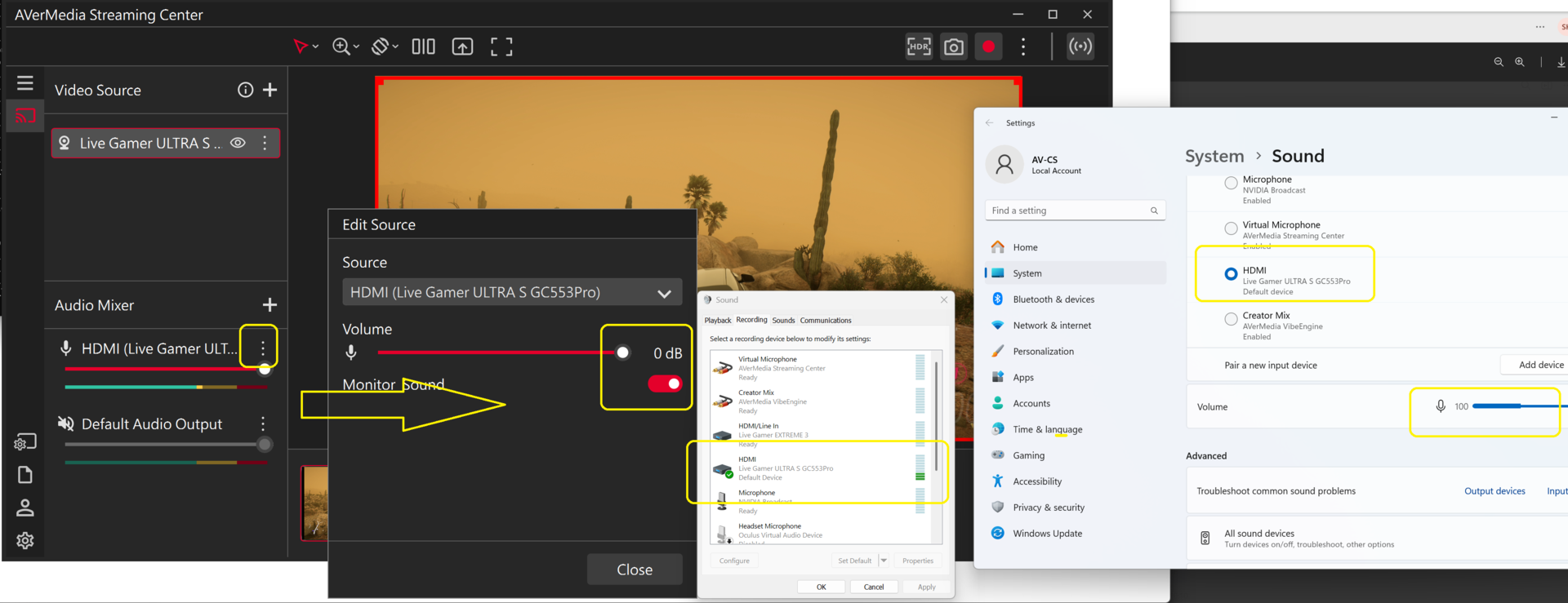 Checking if AVerMedia device capture audio: Go into the Sound setting menu, connect HDMI video source, then see if AVerMedia device capture audio (volume bar flash should be detected)