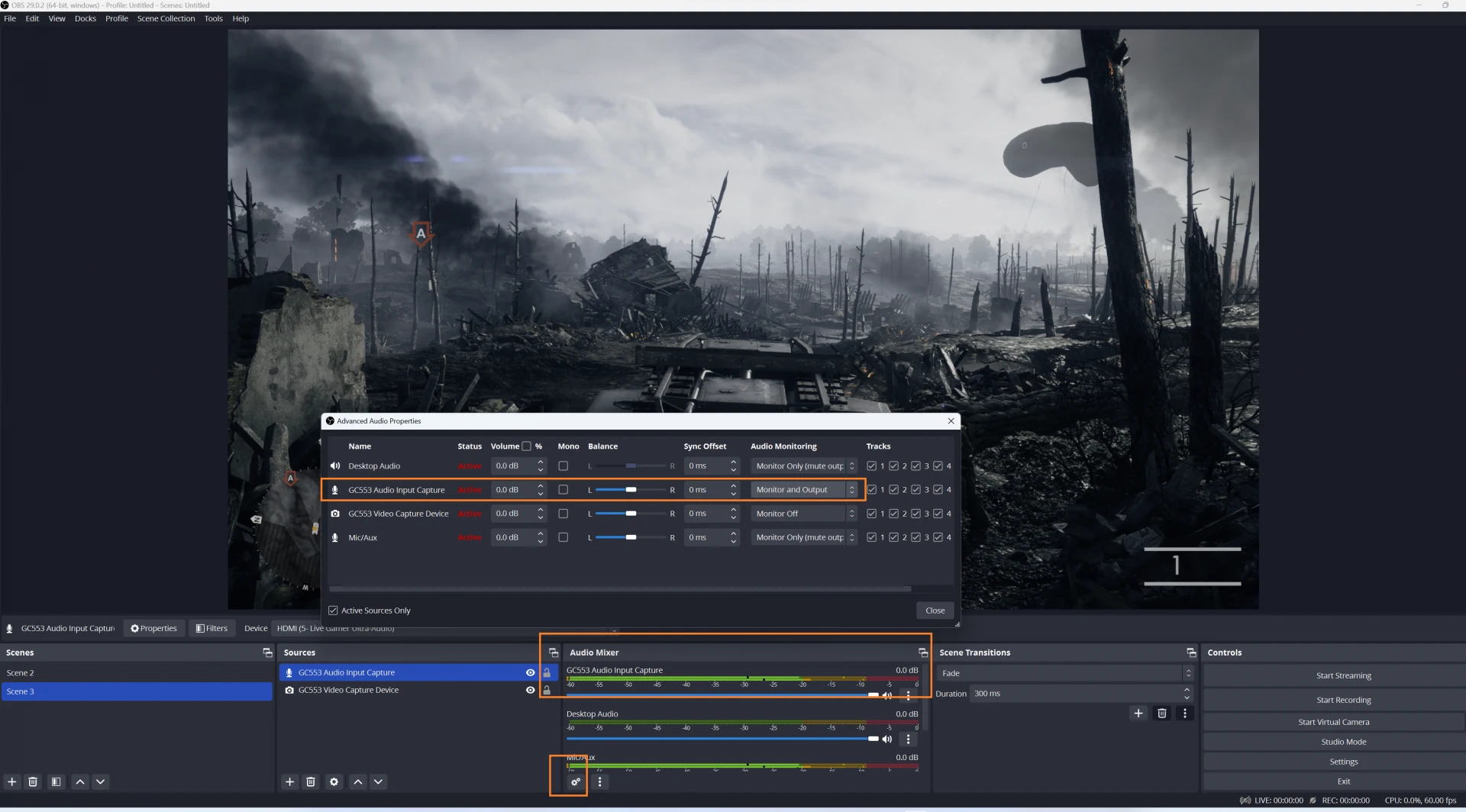 In short, you could add GC553Pro as Audio input device in Source section, and choose Monitor and Output in Audio Monitoring by going into Mixer icon.