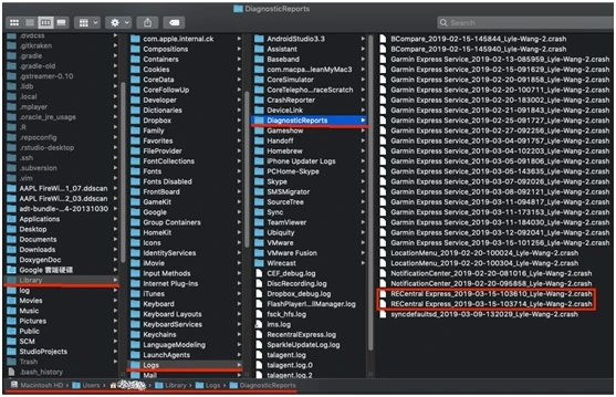 Macintosh HD> Users> XXX> Library> Logs> DiagnosticsReports> RECentral Express_XXXXXXX.crash circled in red color