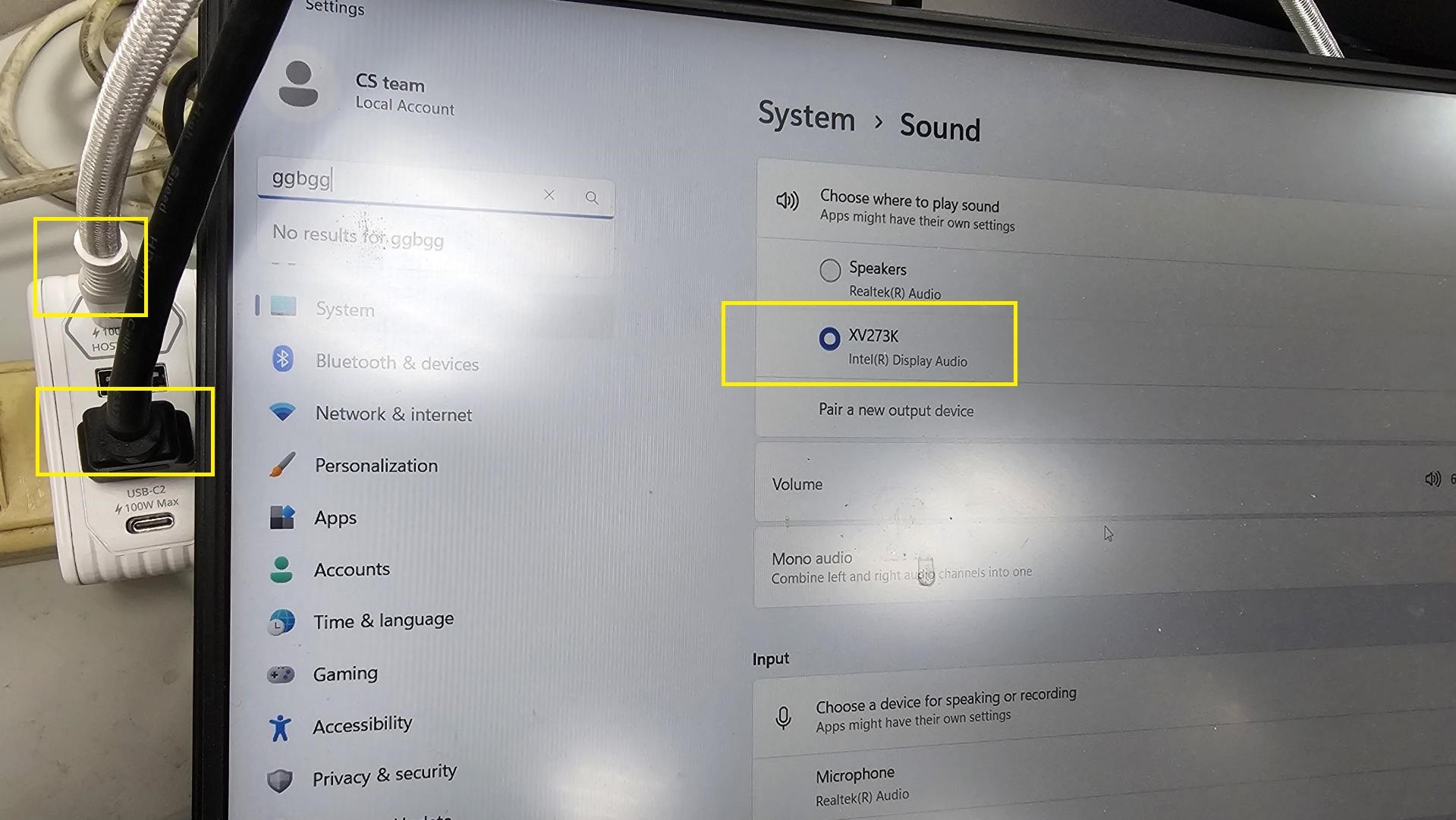 Ensure that the signal source itself has audio output and that you are using the included Type-C to Type-C cable to connect the source to the C1 port of the GC313/GC313Pro. Additionally, make sure your GC313/GC313Pro is connected to a monitor via an HDMI cable (e.g., using a PC as the signal source in the example below).
