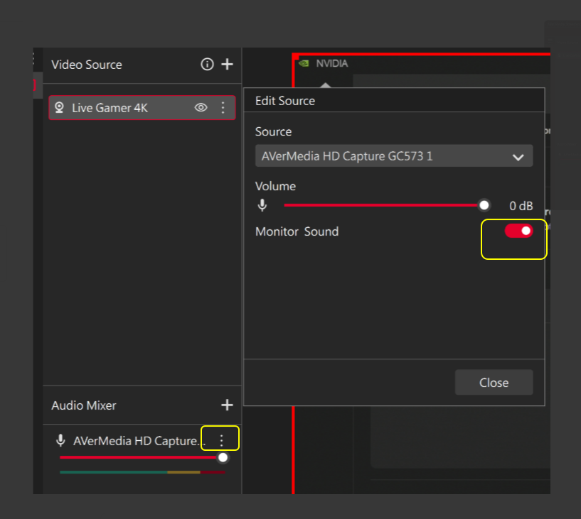In short, you could add GC553Pro as Audio input device in Source section, and choose Monitor and Output in Audio Monitoring by going into Mixer icon.