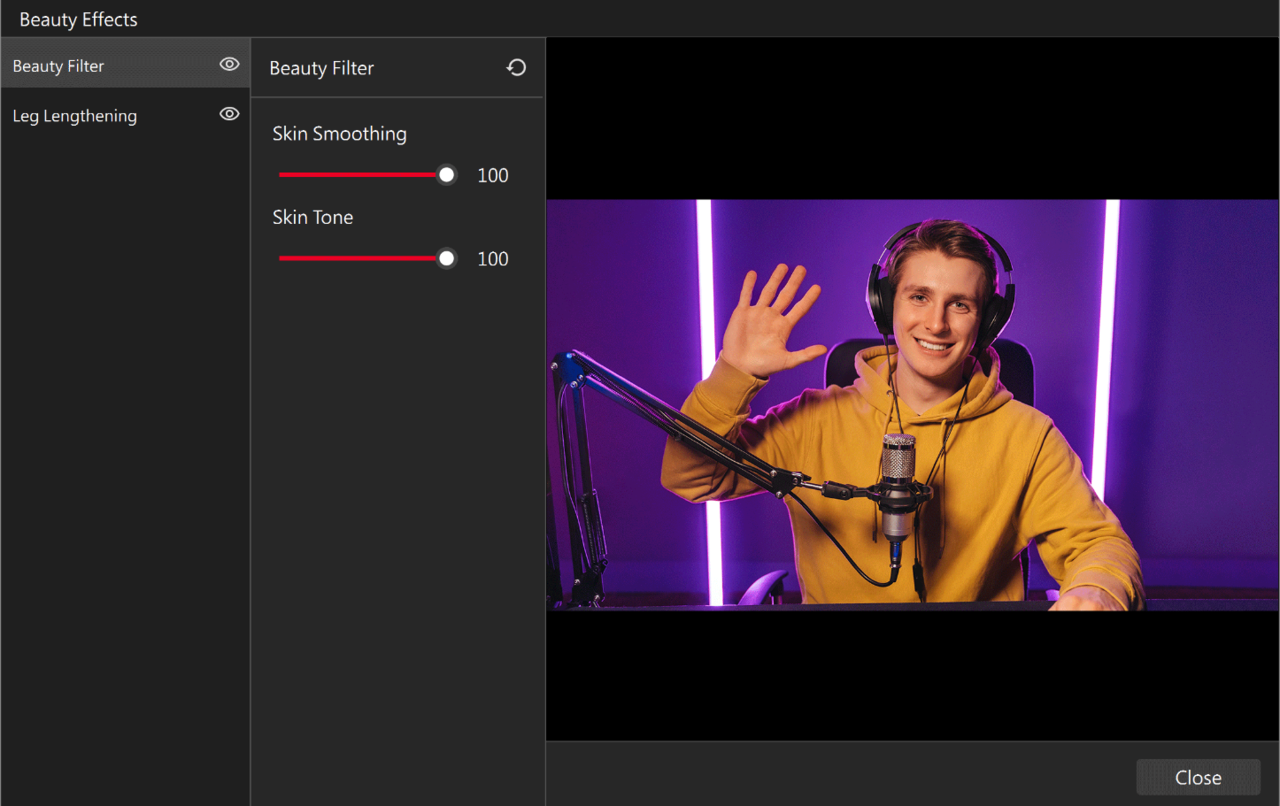 Streaming Center’s built-in beauty filters and leg-lengthening adjustment allows you to enhance your on-screen presence and look your best.