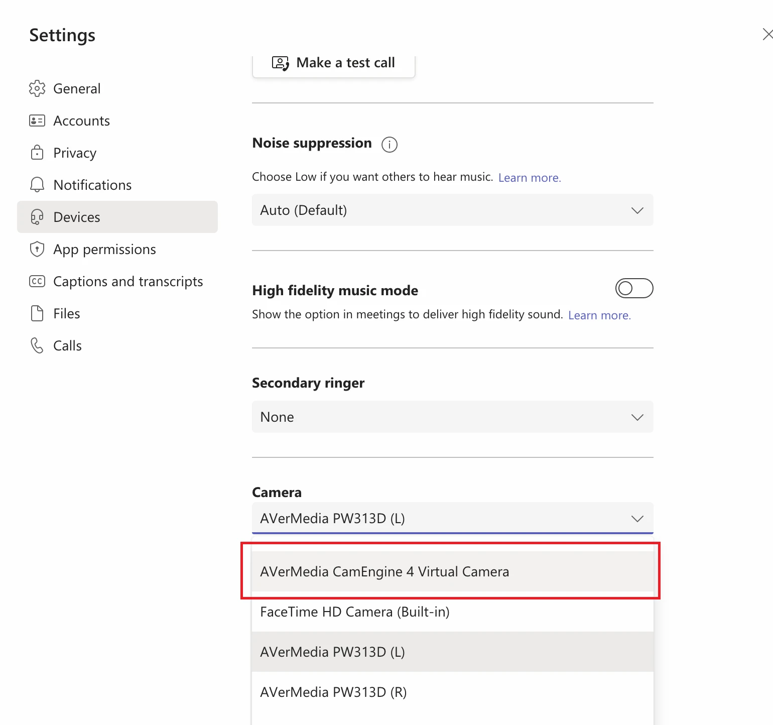 Re-open Microsoft Teams, and Google Chrome, then you can see AVerMedia CamEngine appear in the video Devices.