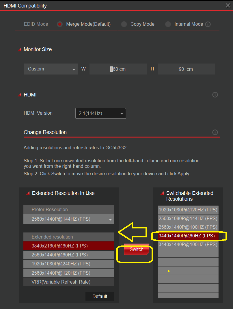 Please follow the instructions in the EDID section to switch between Internal / Merge / Copy mode and test again.