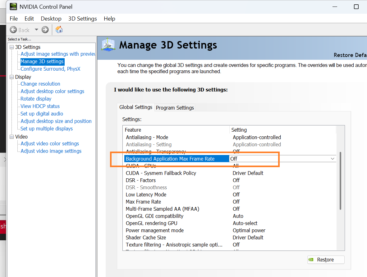 4 If you are using an NVIDIA graphics card, you may open the NVIDIA Control Panel, go to 3D Settings, and set “Background Application Max Frame Rate” to Off, then check whether the preview performance improves.