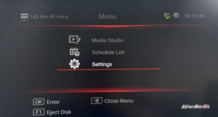 2.      Set up the ER330’s network. Turn on the ER330, use the remote control to open the menu, scroll to 'Settings,' and select it: