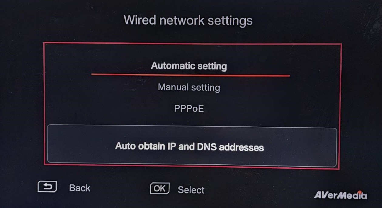 Press the Back arrow to return to Settings; you will see that 'Automatic Setting' is selected under Network: