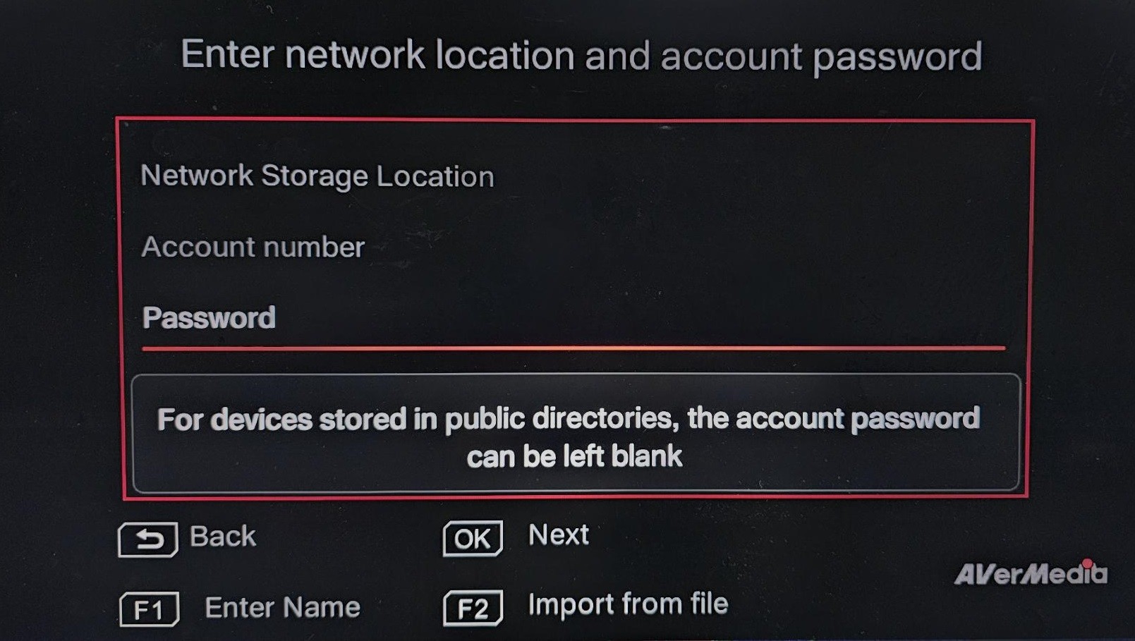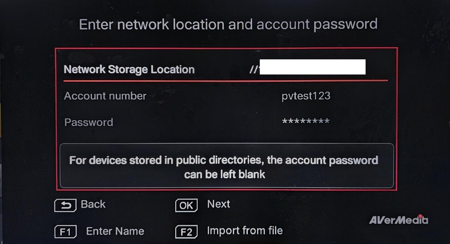 • Under "Enter Network Location and Account Password," press F2 to Import from File.
