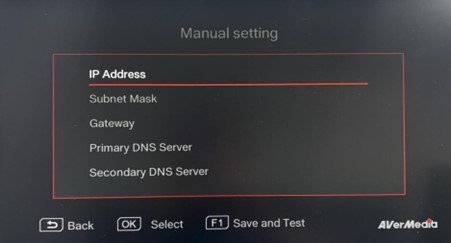 Go to 'Network' and press OK to enter the next level. Select 'Wired Network Settings,' then choose 'Manual Setting' and enter your ER330’s network information. Once all data is entered, press F1 to save: