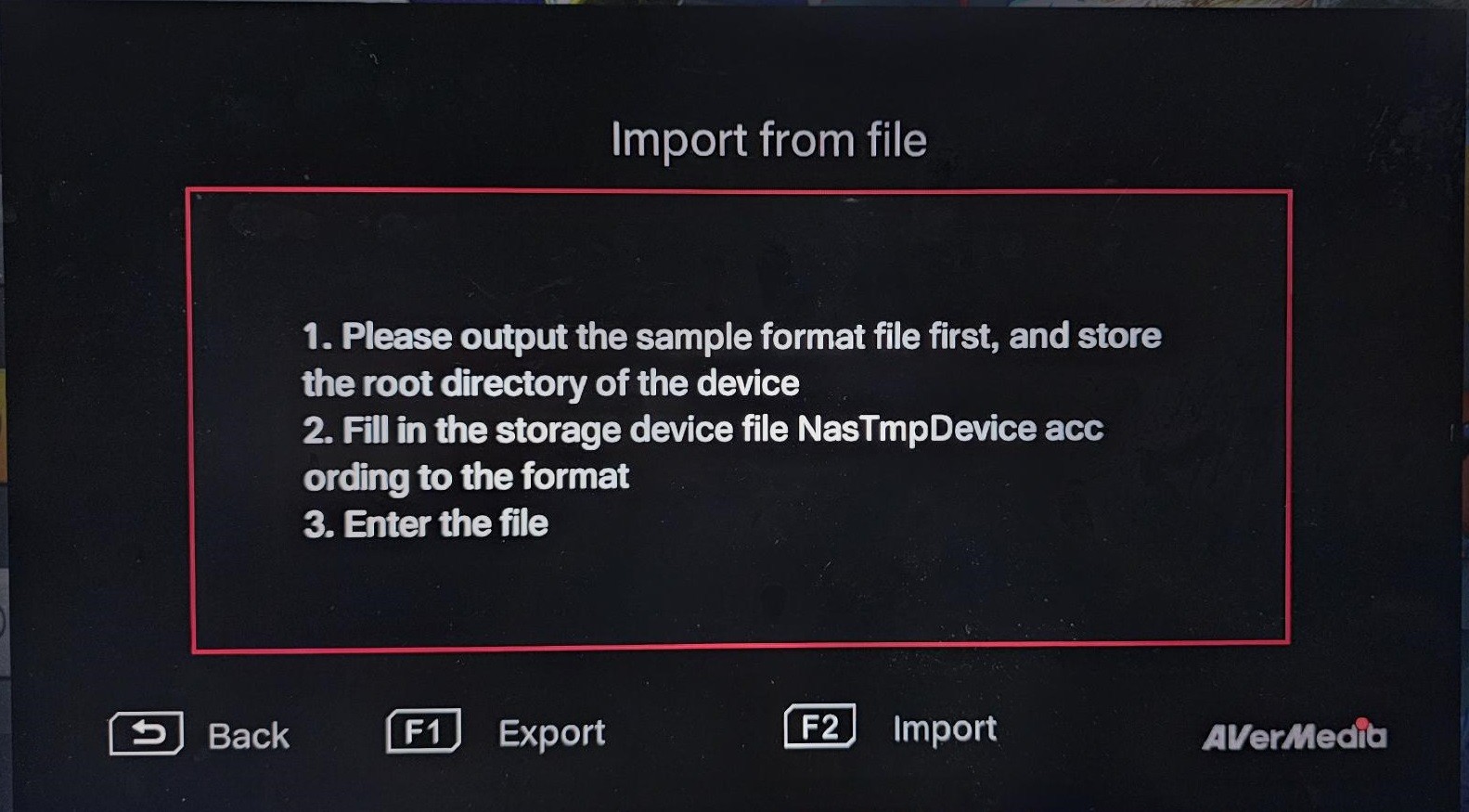 • Press F1 and choose 'Export'. Press F2 to export the NAS configuration file. This way, the NasTmpDevice.txt file will be saved in the external hard drive connected to ER330.