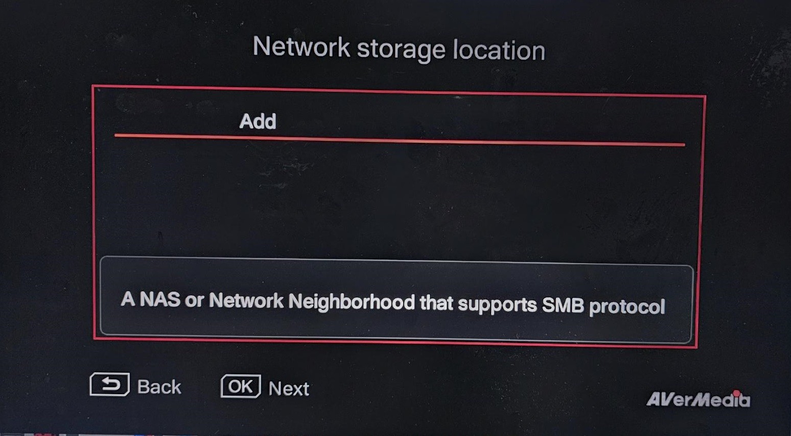 • Select "Add" for the network storage location and press OK.