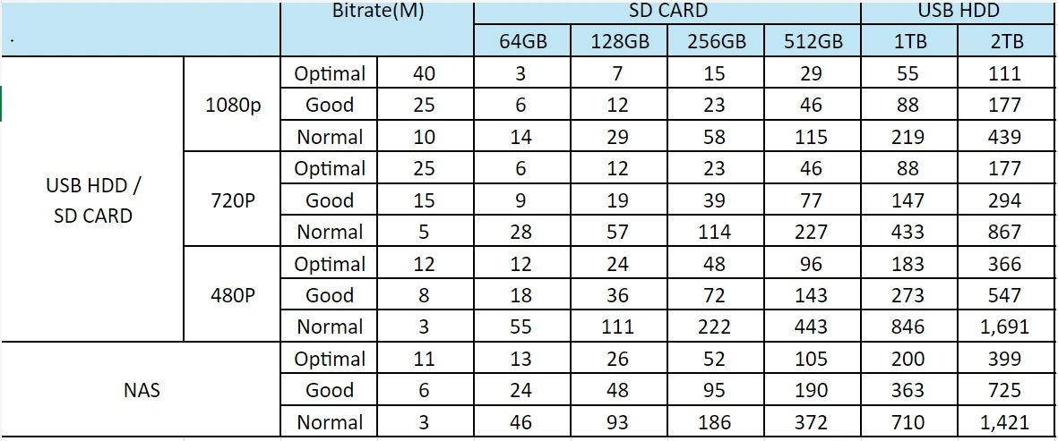 Please also refer to : Storage Device and Recording Settings Time Reference Table: