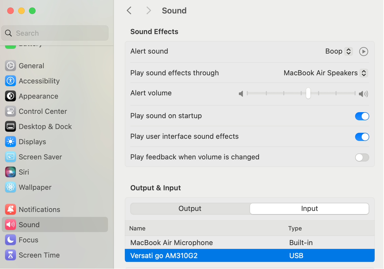 On macOS, check if the AM310G2 device shows up in Sound Input: