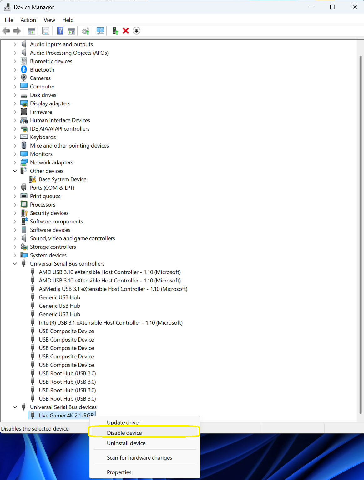 3. Re-enable the GC553G2/GC575 RGB Device: Once disabled, re-enable it and then run the firmware update tool immediately again to check if the update is successful.
