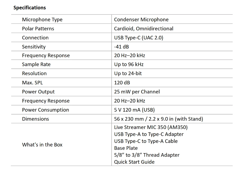 The AM350 features a dual microphone pickup pattern design, offering both cardioid and omnidirectional modes for versatile recording. Its intuitive studio controls allow for zero-latency monitoring through the built-in headphone output and effortless toggling between microphone and system sounds, allowing for complete audio control. Plus, the AM350 automatically saves your last audio settings, eliminating the need for readjustment in future use.
