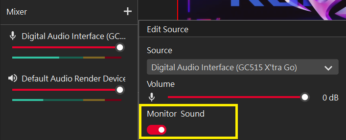 3. Check that the audio input device (GC515) is enabled for output in both Streaming Center