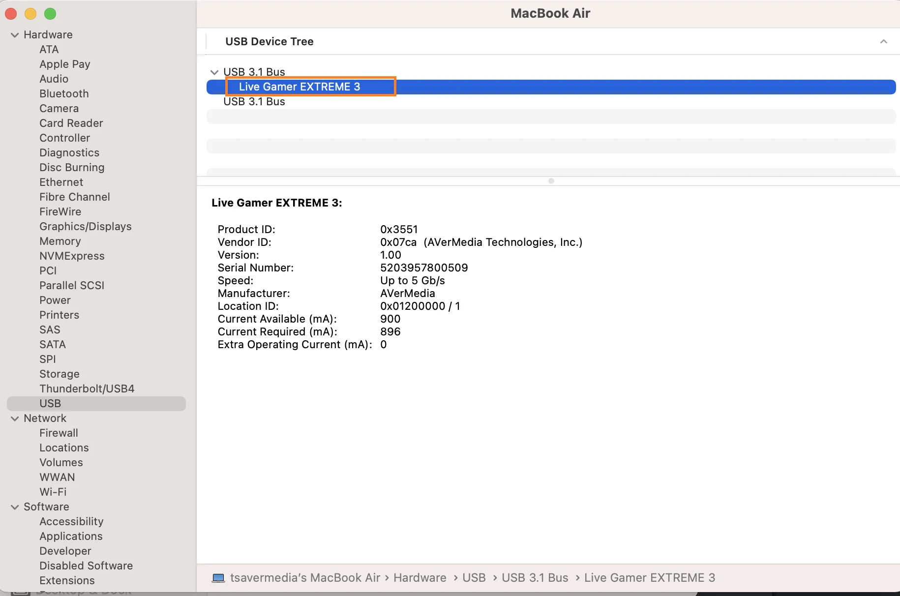 macOS: Please head into: Mac>System report>Hardware>USB>USB Device Tree