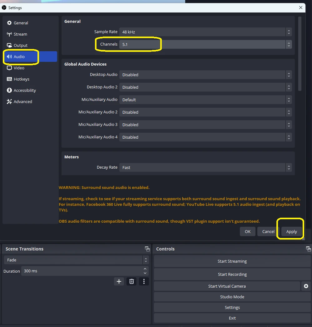 Check Video Source to confirm the source recognize 5.1 channel, then choose Audio 5.1 on the Setting icon in Streaming Center