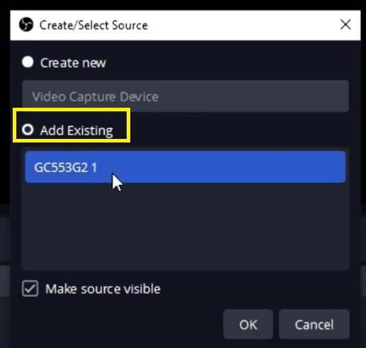 For Scene 2, you need to click "Add Existing" and select the Video Capture source name(The name circled in yellow square)