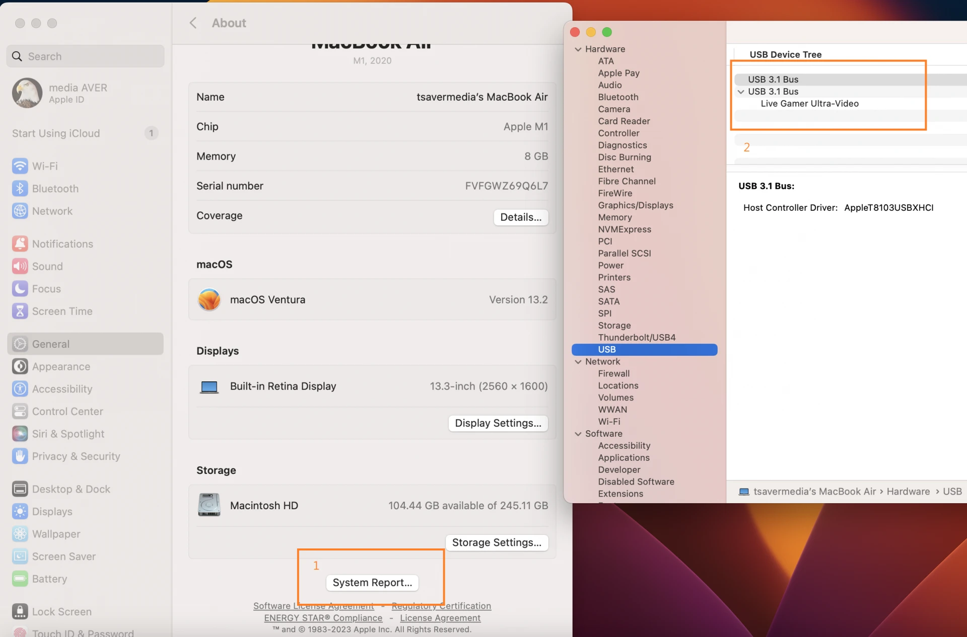 macOS: Please head into: Mac>System report>Hardware>USB>USB Device Tree