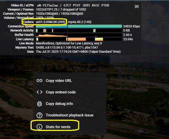 4 When your YouTube video is playing, you can right-click on the video and select "Stats for nerds" to check if AV1 is being used as the codec.