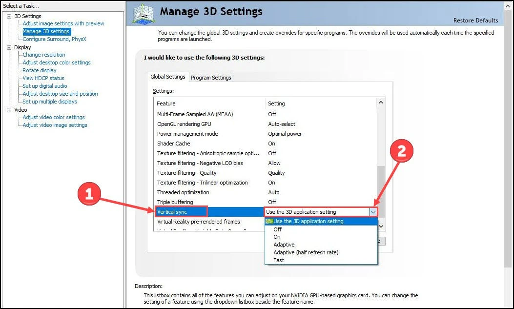 - Click 3D Settings and then Manage 3D Settings, then Scroll down and click Vertical sync, and open the drop-down menu