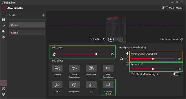 3. The Clipping Shield and microphone original sound settings, as marked in the orange box blew, are stored in the AM350 device.