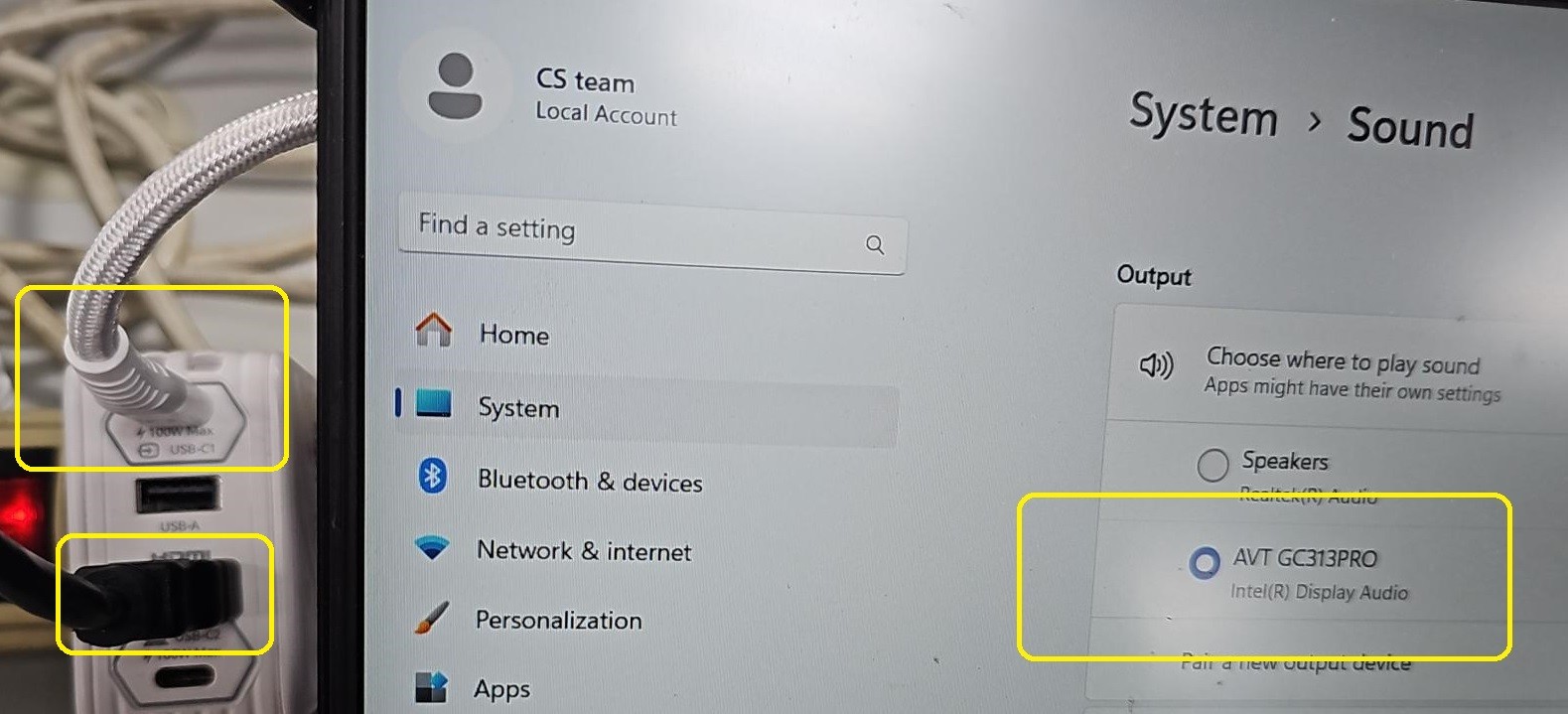 Ensure that the signal source itself has audio output and that you are using the included Type-C to Type-C cable to connect the source to the C1 port of the GC313/GC313Pro. Additionally, make sure your GC313/GC313Pro is connected to a monitor via an HDMI cable (e.g., using a PC as the signal source in the example below).